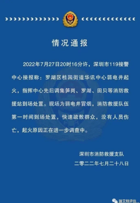 深圳消防通報(bào):2022年7月27日20時(shí)16分許,深圳市119接警中心接報(bào)稱:羅湖區(qū)桂園街道華訊中心弱電井起火,現(xiàn)場為弱電井冒煙,沒有人員傷深圳消防通報(bào):2022年7月27日20時(shí)16分許,深圳市119接警中心接報(bào)稱:羅湖區(qū)桂園街道華訊中心弱電井起火,現(xiàn)場為弱電井冒煙,沒有人員傷亡,起火原因正在進(jìn)一步調(diào)查中。